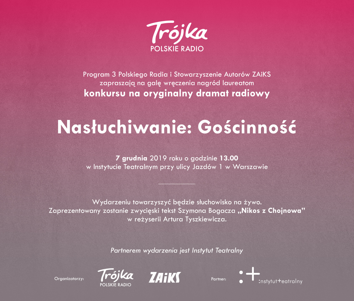 - Słuchowisko na żywo: Szymon Bogacz, Nikos z Chojnowa, reż. Artur TyszkiewiczUroczystości rozdania nagród towarzyszyć będzie słuchowisko na żywo na podstawie nagrodzonej sztuki Szymona Bogacza.