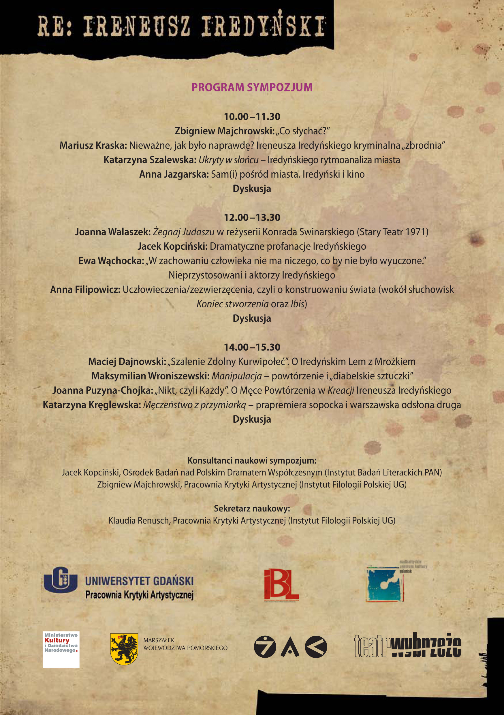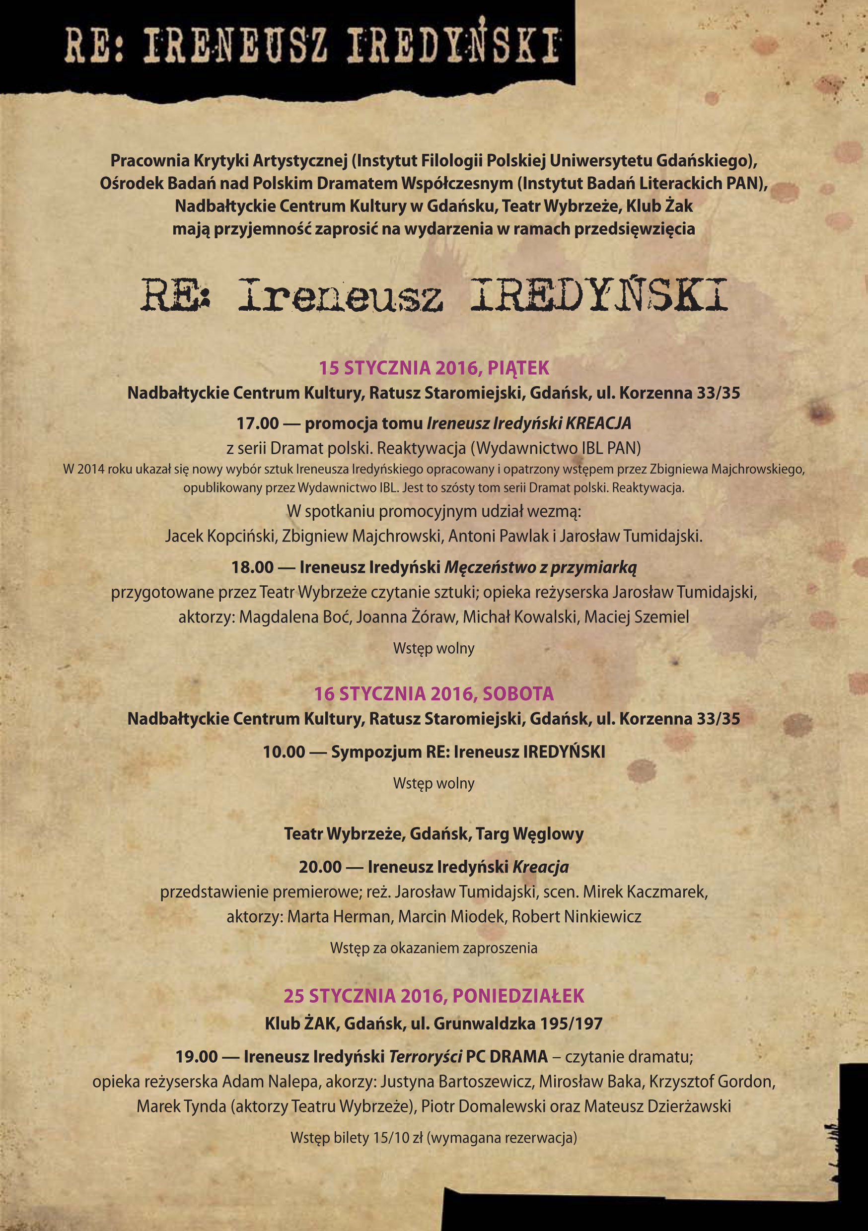 Pracownia Krytyki Artystycznej (Instytut Filologii Polskiej Uniwersytetu Gdańskiego) we współpracy z Ośrodkiem Badań nad Polskim Dramatem Współczesnym (Instytut Badań Literackich PAN) oraz z Nadbałtyckim Centrum Kultury w Gdańsku, przy udziale Teatru Wybrzeże oraz Klubu Żak mieli przyjemność zaprosić na wydarzenia w ramach przedsięwzięcia zatytułowanego: