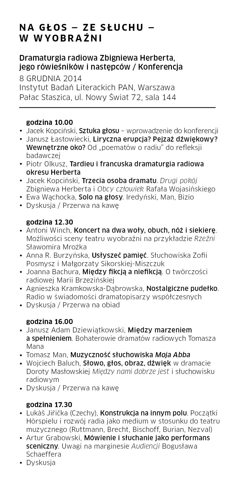 8 grudnia 2014 roku w Instytucie Badań Literackich PAN w Warszawie odbyła się konferencja NA GŁOS – ZE SŁUCHU – W WYOBRAŹNI. Dramaturgia radiowa Zbigniewa Herberta, jego rówieśników i następców, podczas której znawcy dramatu i teatru zderzyli ze sobą twórczość i myśl estetyczną pisarzy pokolenia Zbigniewa Herberta i współczesnych. Podczas konferencji wzajemnie uzupełniały się trzy perspektywy: literacka, radiowa i teatralna. Wśród referentów nie zabrakło też praktyków twórczości radiowej.